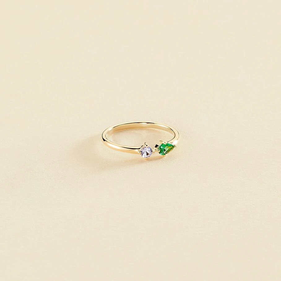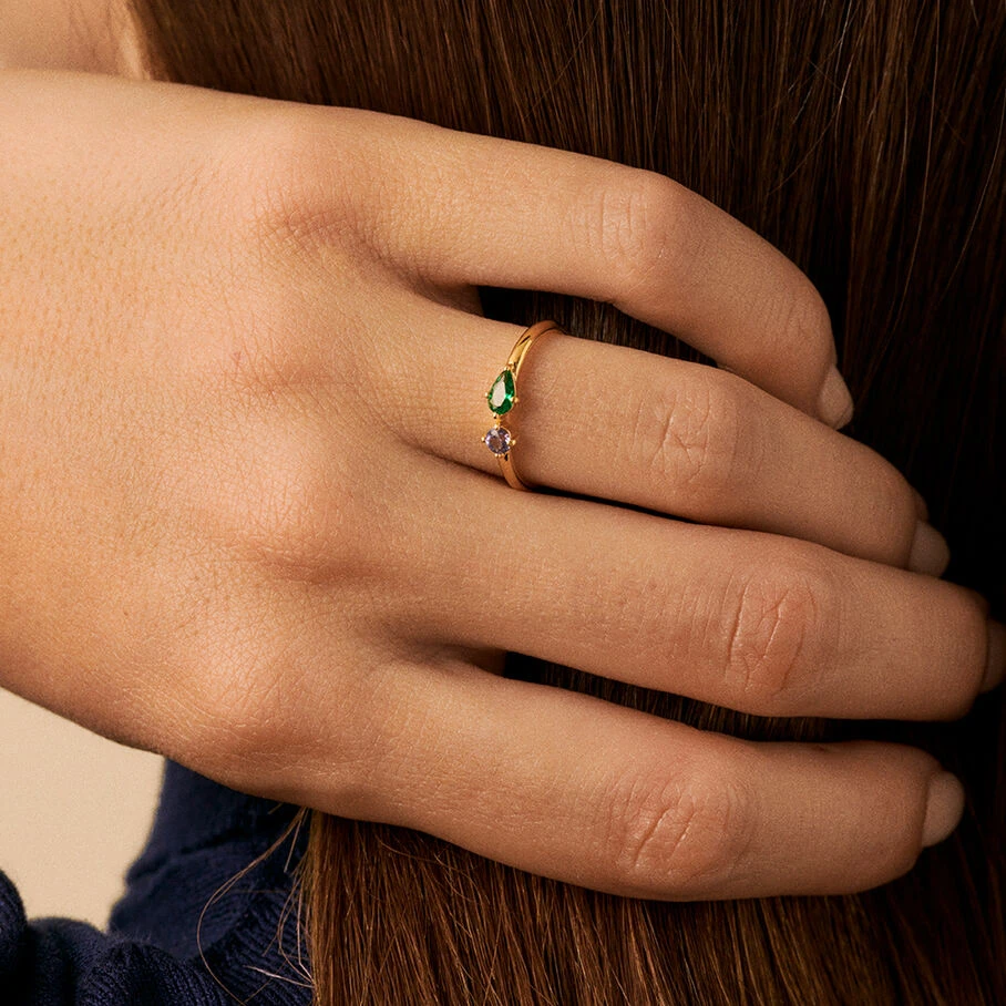 Bague fine, en argent véritable doré 750/1000, sertie de deux oxydes de zirconium de forme goutte et ronde