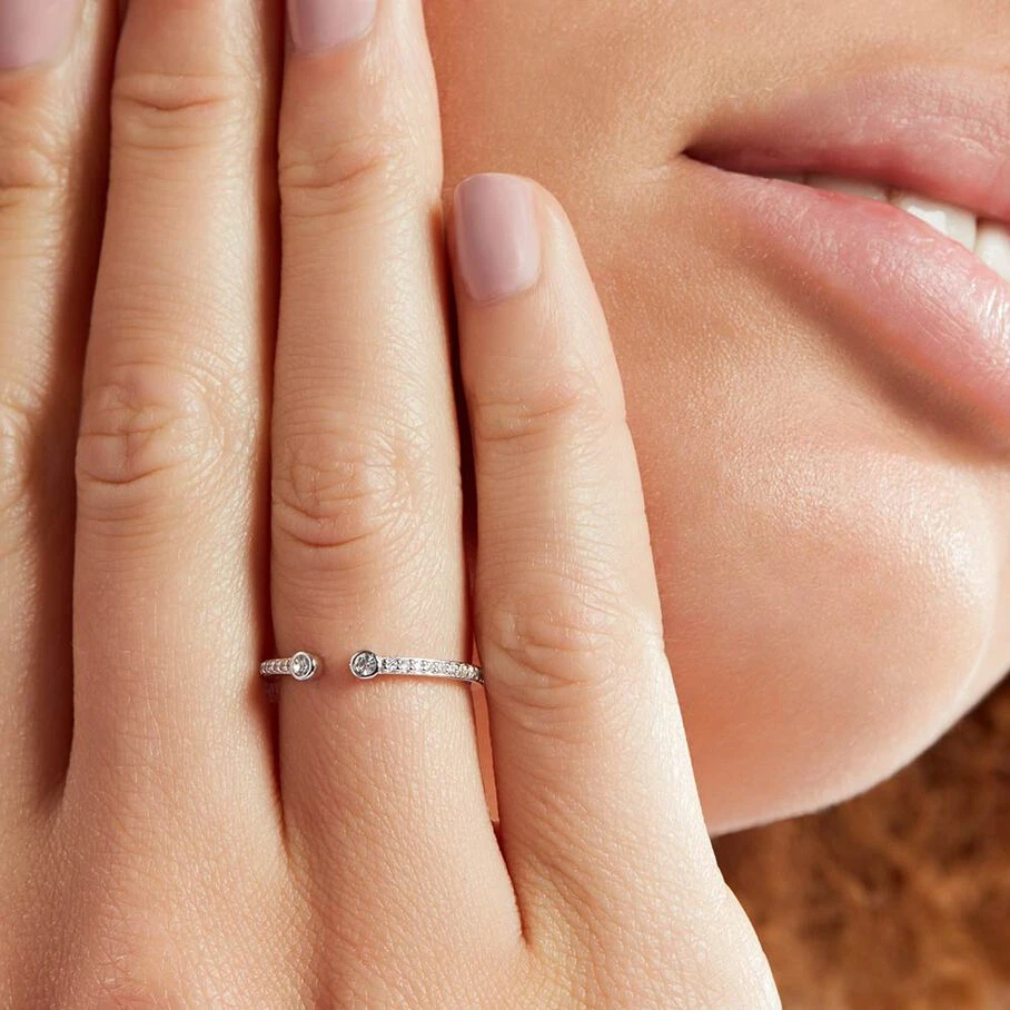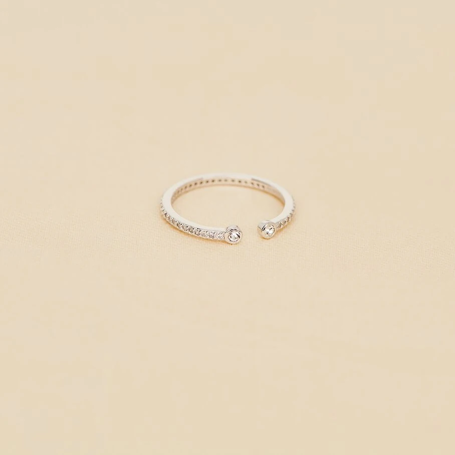 Bague fine ouverte en argent véritable pavée d’oxydes de zirconium et et ornée de deux oxydes sertis aux extrémités