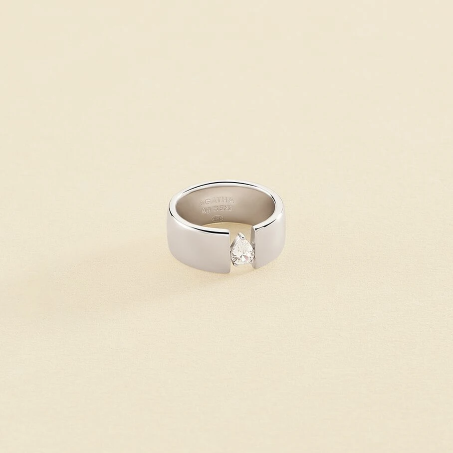 Bague large, en argent véritable, avec un oxyde de zirconium de forme poire enserré dans le corps de bague