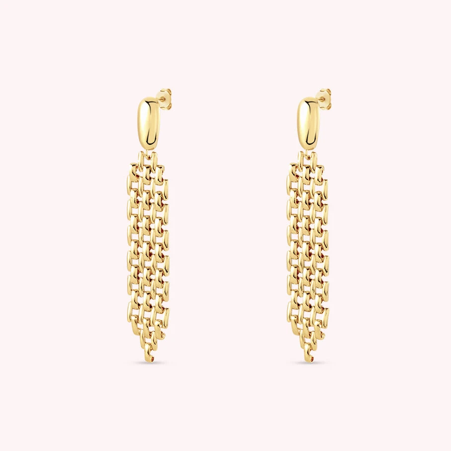 Boucles d’oreilles longues, en laiton et étain, dont la maille ressemble à une maille de montre