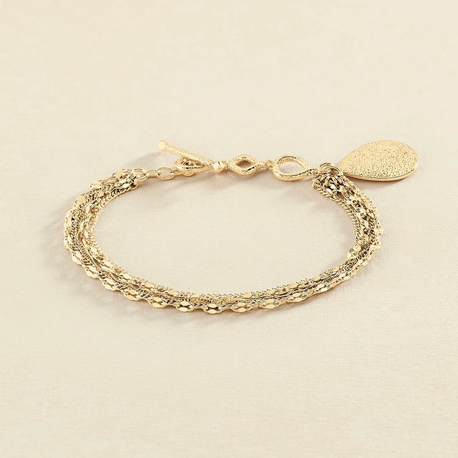 Bracelet, en laiton doré 750/1000, composé de 5 chaines fines. On signe ce bracelet avec un fermoir barrette, si identitaire à la marque et une médaille, en pampille, sur laquelle est gravé une citation positive sur la vie