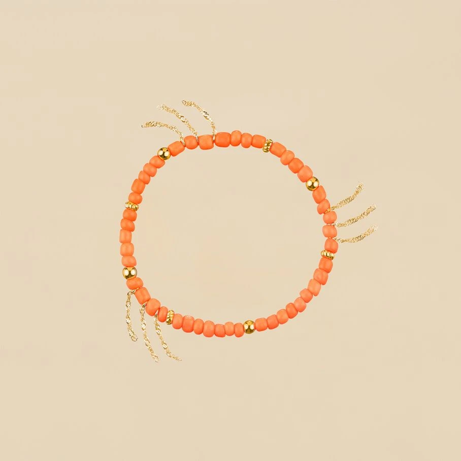 Bracelet elastique, en laiton doré 750/1000, perles de verre enfilées et pompons de chaines