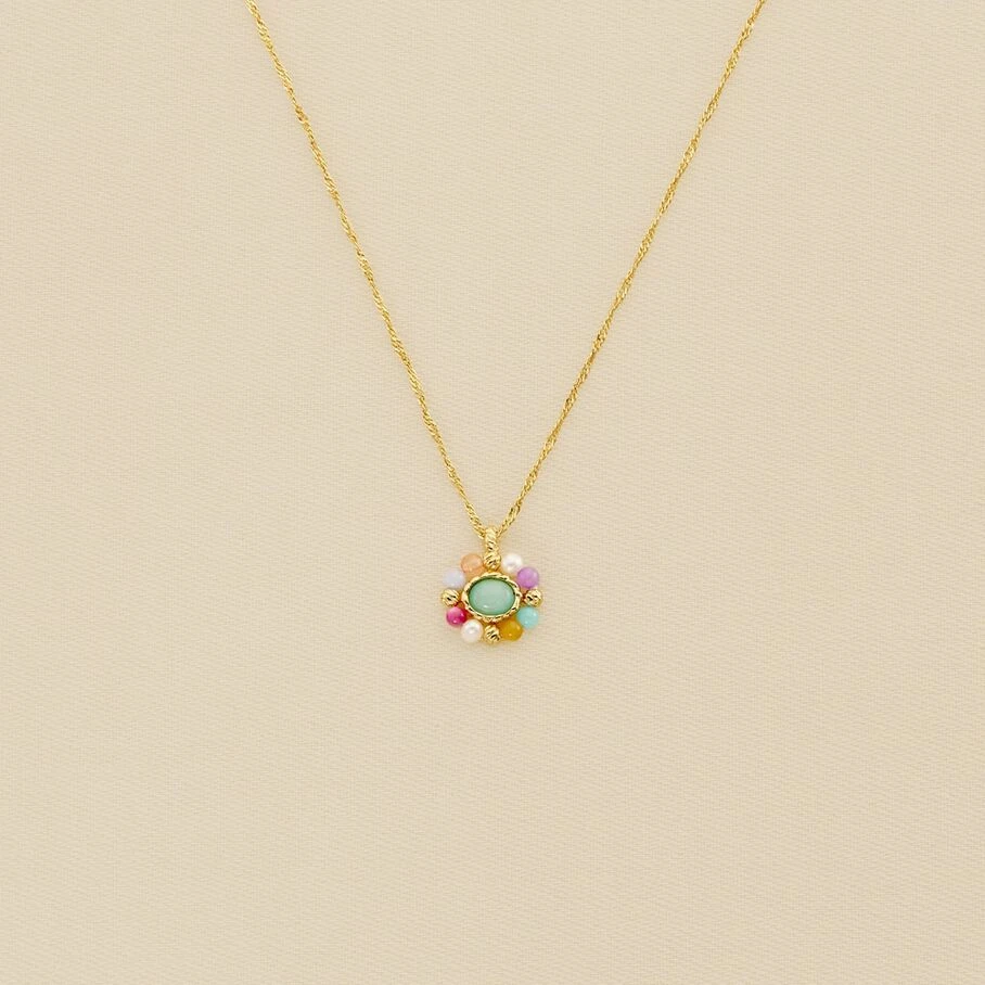 Collier court en laiton doré 750/1000, avec une pierre naturelle entournée de minis pierres colorées sur chaîne.