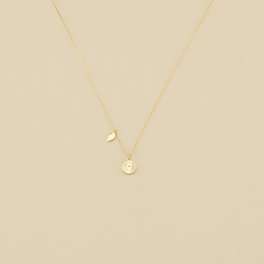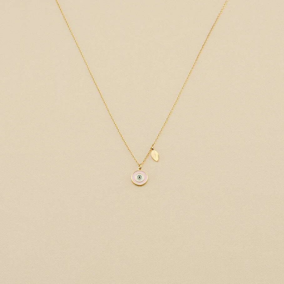 Collier court, en laiton doré à l’or fin, avec un œil turc et un coquillage sur chaine en pendentifs