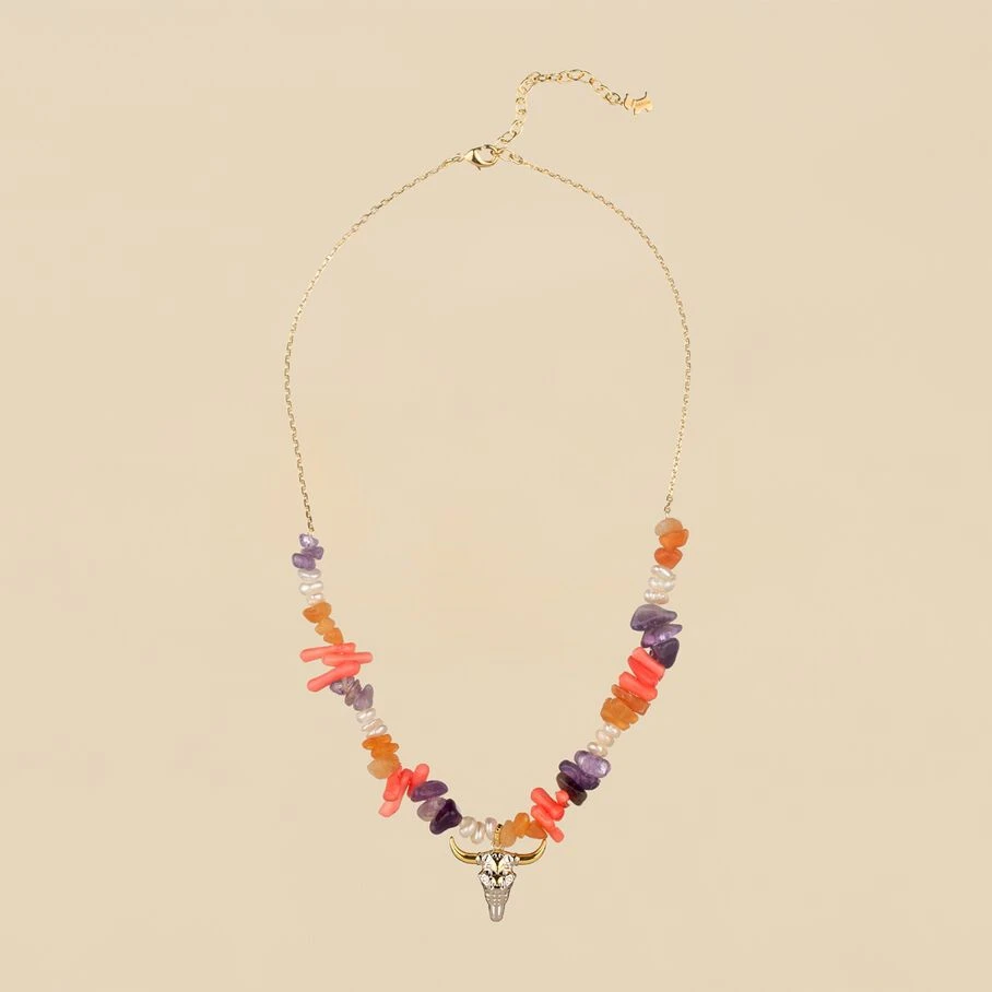 Collier court, en laiton doré 750/1000, section de pierres fines et tête de buffle en pendentif