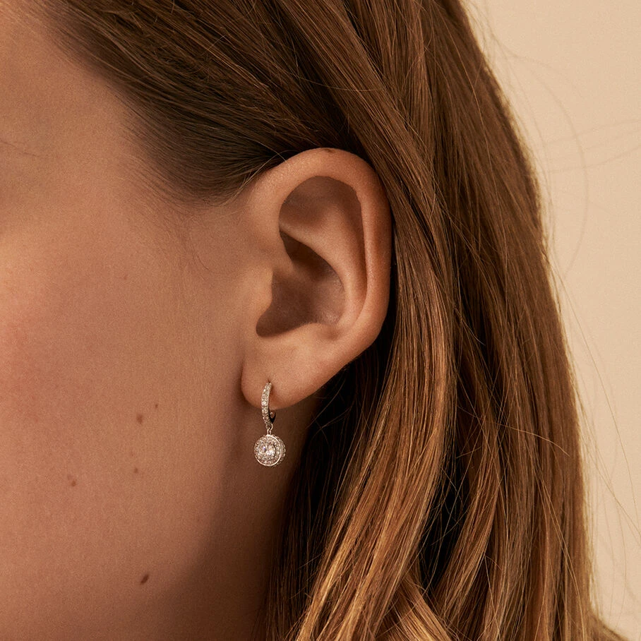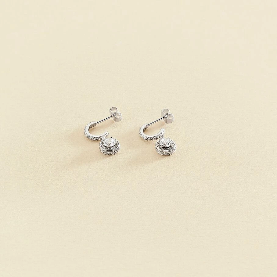 Créoles, en argent véritable, avec, en breloque, un mini oxyde rond autour duquel sont micro sertis des oxydes de zirconium