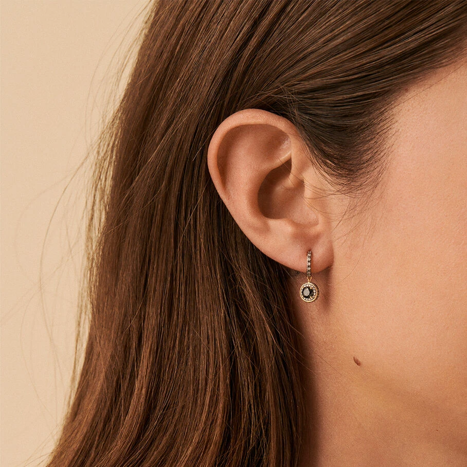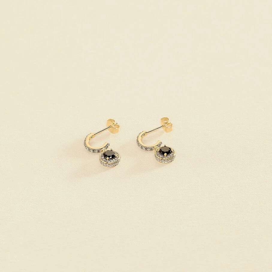 Créoles, en argent véritable doré 750/1000, avec, en breloque, un mini oxyde rond autour duquel sont micro sertis des oxydes de zirconium