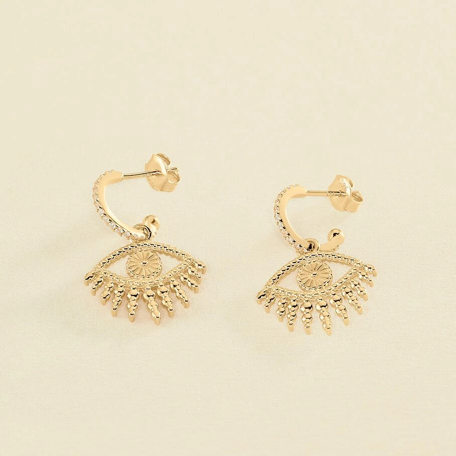 Créoles de 14mm de diamètre, en argent véritable 925/1000 et dorées 750/1000, sur lesquelles un œil turc a été ajouté en breloque. L’iris émaillé et le contour de l’œil serti d’oxydes de zirconium apportent un vrai raffinement et éclat au produit! Au besoin la breloque peut se retirer pour un look déparaillé ou encore un look plus simple avec de petites créoles serties d’oxydes de zirconium seulement. Des boucles d’oreilles 3 en 1 à porter au gré de vos tenues et humeur!