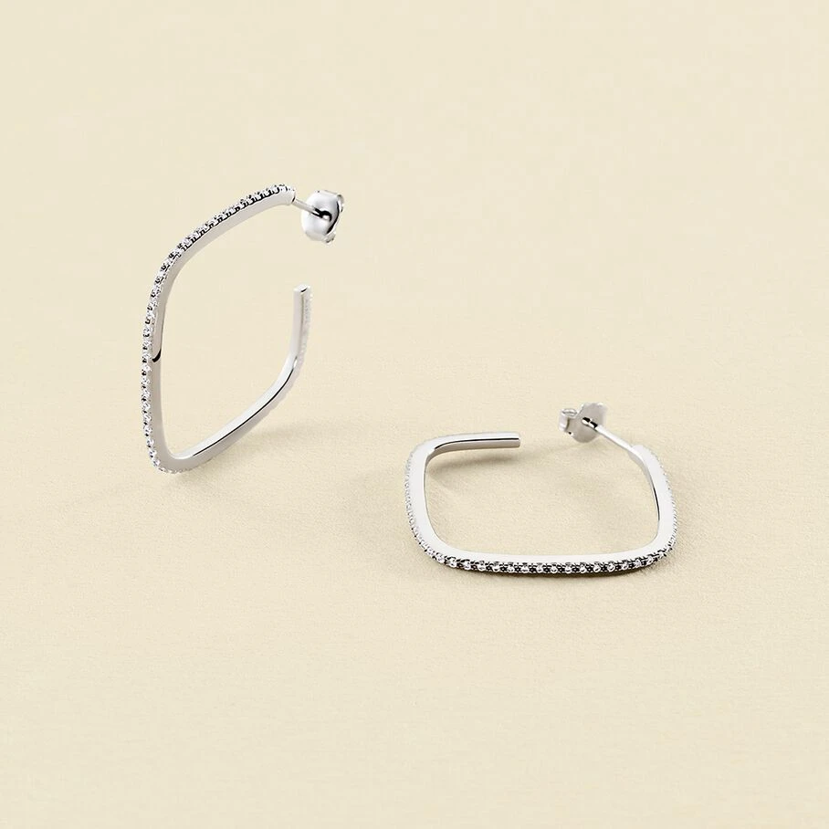 Créoles portées de face, carrés ajourés et pavés d’oxydes de zirconium, en argent véritable.