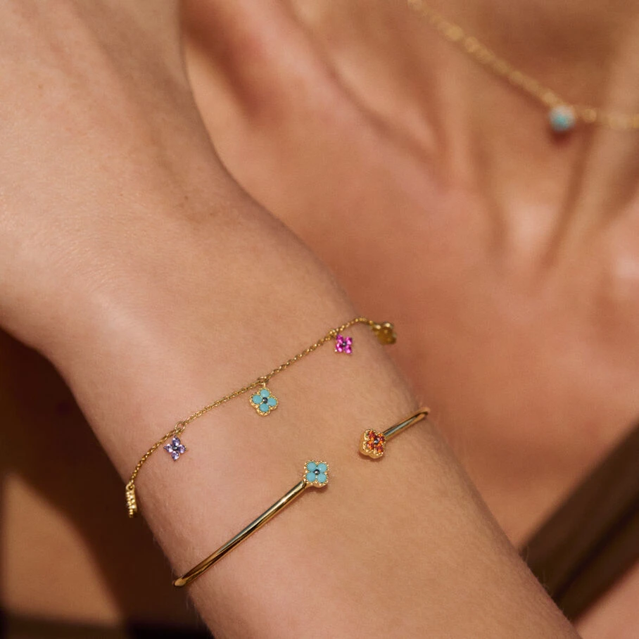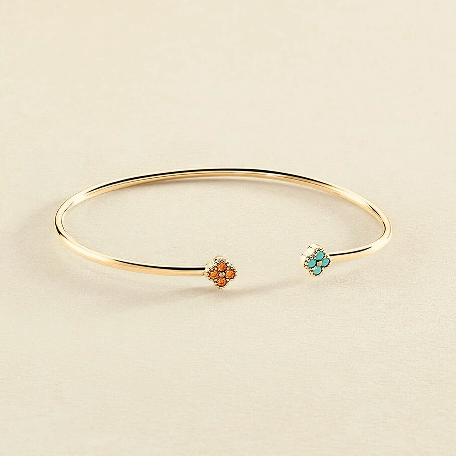 Jonc fin ouvert, en argent véritable doré 750/1000, avec des fleurs d’oxydes de zirconium aux extrémités et un fin graineti sur le pourtour