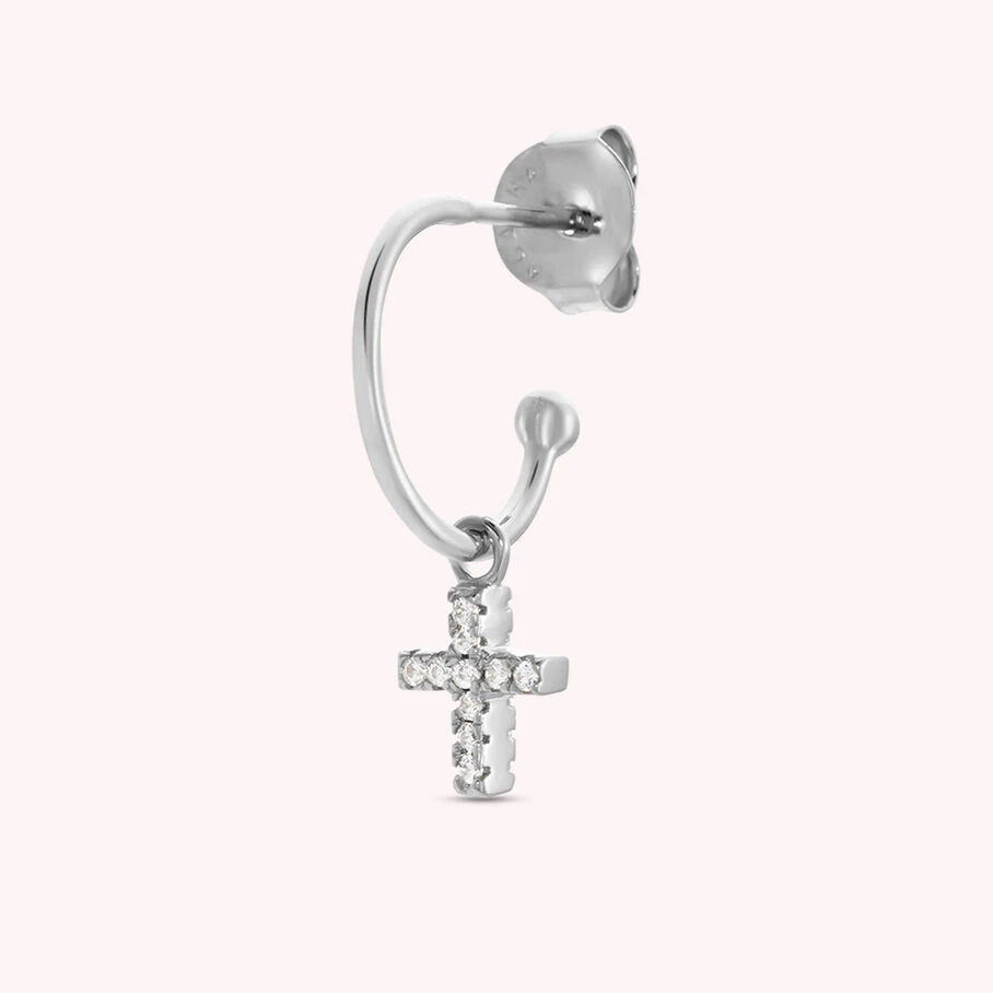 Mini créole en argent véritable ornée d’une croix pavée d’oxydes de zirconium en pampille. A l’unité, pour mieux les mixer et les accumuler.