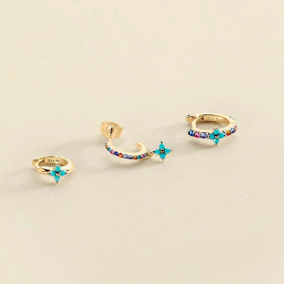 Set de 3 boucles d’oreilles créoles, en argent véritable doré 750/1000, dont le motif récurrent a une forme de fleur;