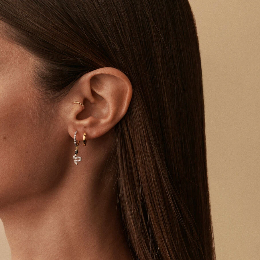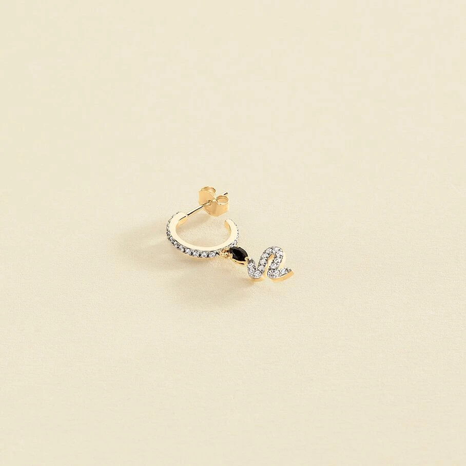Mini créole argent doré à l’or fin avec une pampille serpent pavée d’oxydes de zirconium noirs. A l’unité, pour mieux les mixer et les accumuler.