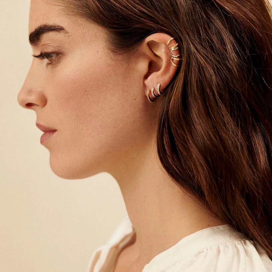 Faux piercing en argent doré à l’or fin, bague d’oreille en fils croisés. A l’unité, pour mieux les mixer et les accumuler.