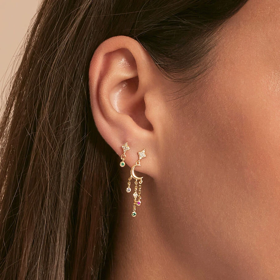 Boucle d’oreille puce, en argne doré 750/1000, losange pavé d’oxydes de zirconium et un oxyde de zirconium serti en pampille. A l’unité, pour mieux les mixer et les accumuler