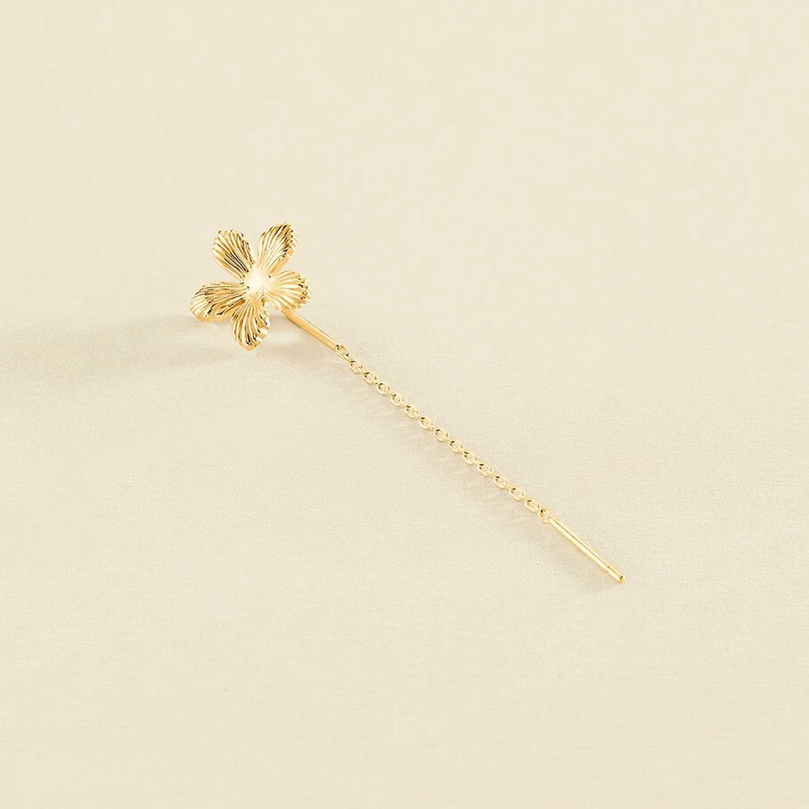 Boucle d’oreille pull trough, fleur sur le devant et chaine longue à l’arrière de l’oreille, en argent doré 750/1000. A l’unité, pour mieux les mixer et les accumuler.