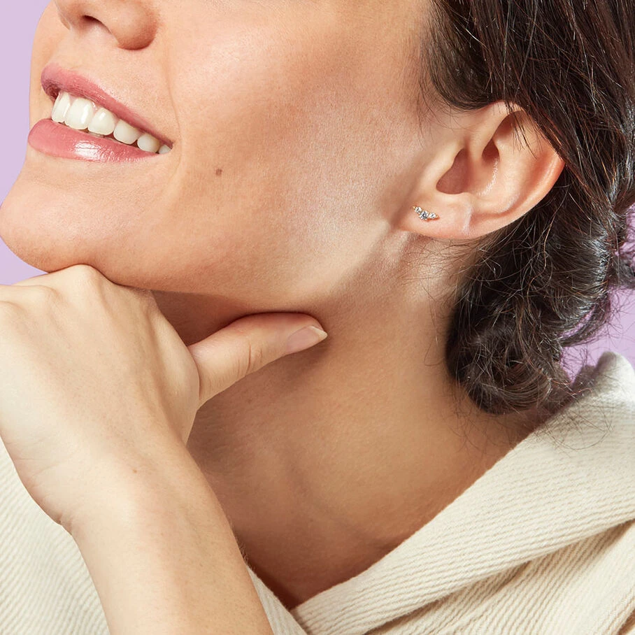Boucle d’oreille puce en argent doré 750/1000 en forme de croissant avec 3 oxydes de zirconium sertis. A l’unité, pour mieux les mixer et les accumuler.