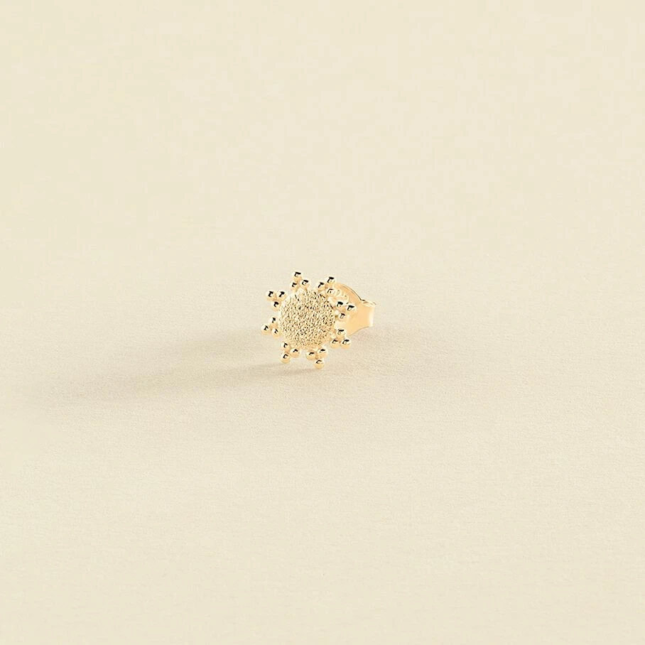 Boucle d’oreille, soleil anec un effet sablé brillant, en argent doré 750/1000. A l’unité pour mieux les mixer et les accumuler.