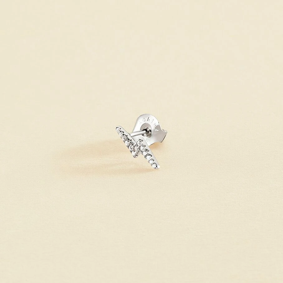 Boucle d’oreille puce en argent véritable en forme d’éclair pavé d’oxydes de zirconium. A l’unité, pour mieux les mixer et les accumuler.