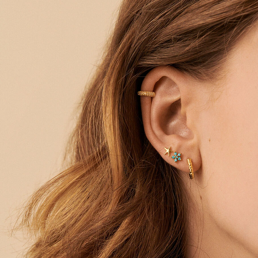 Boucle d’oreille puce en argent véritable doré 750/1000 en forme de fleur pavée d’oxydes de zirconium. A l’unité, pour mieux les mixer et les accumuler.