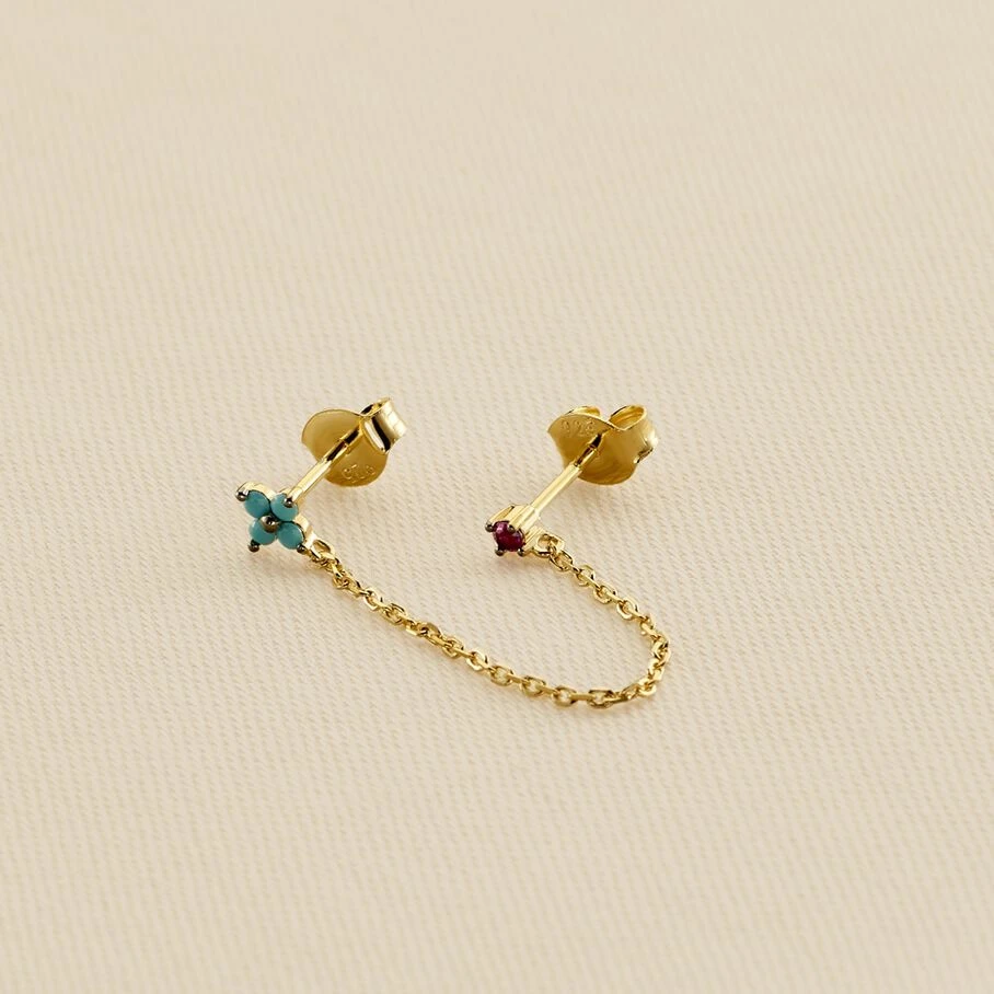 Boucle d’oreille double puces à l’unité, en argent 925/1000 et dorée 750/1000, réprésentant deux fleurs pavées d’oxydes de zirconium colorés. Les deux puces sont reliées par une délicate chaine de la même matière.