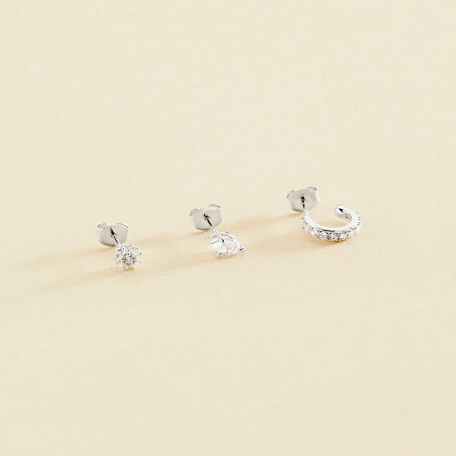 Set de 3 boucles d’oreilles : une créole et une fleur pavées d’oxydes de zirconium et un oxyde de zirconium navette griffé, en argent véritable.