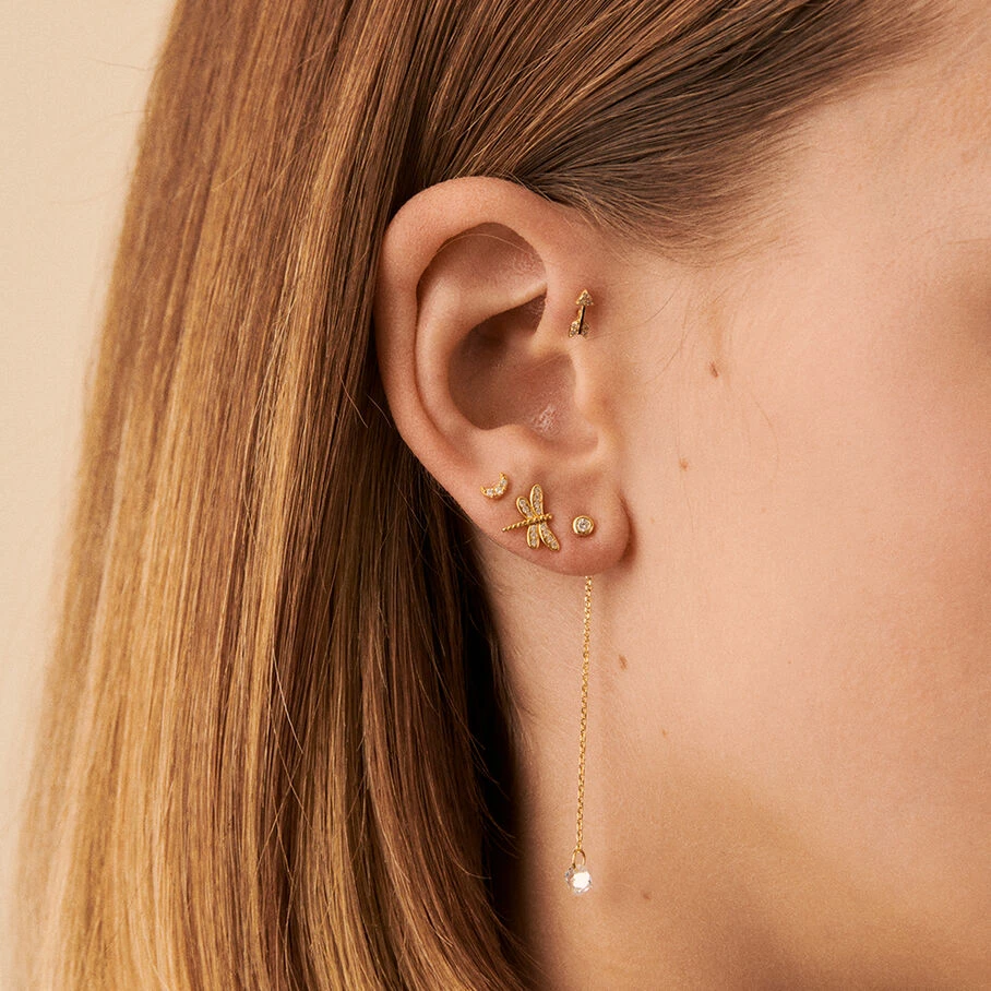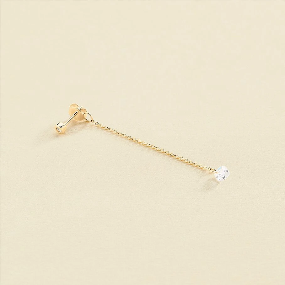Boucle d’oreille puce boule et chaine accrochée au papillon avec un oxyde de zirconium en forme de coussin percé au bout de la chaine, en argent véritable doré 750/1000. A l’unité pour mieux les mixer et les accumuler