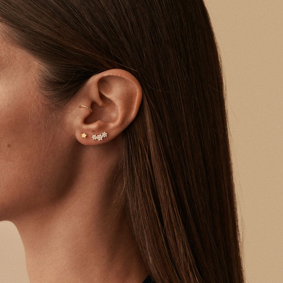 Boucle d’oreille puce argent doré 750/1000 en forme de trois fleurs pavées d’oxydes de zirconium. A l’unité, pour mieux les mixer et les accumuler.