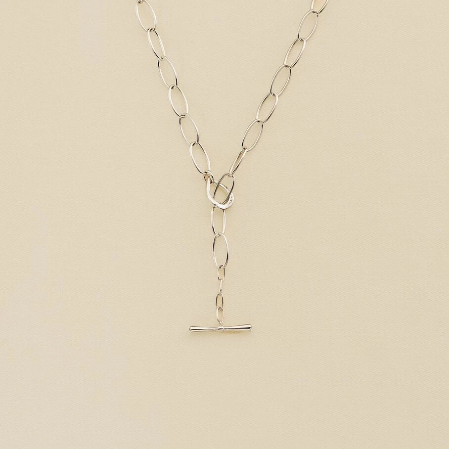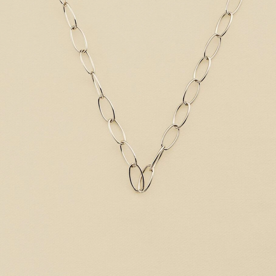 Collier multi-portés, en laiton rhodié, constitué de maillons ovales allongés. Il peut se porter aussi bien en collier mi-long qu’en collier Y!
