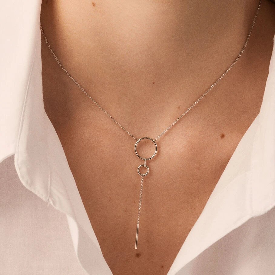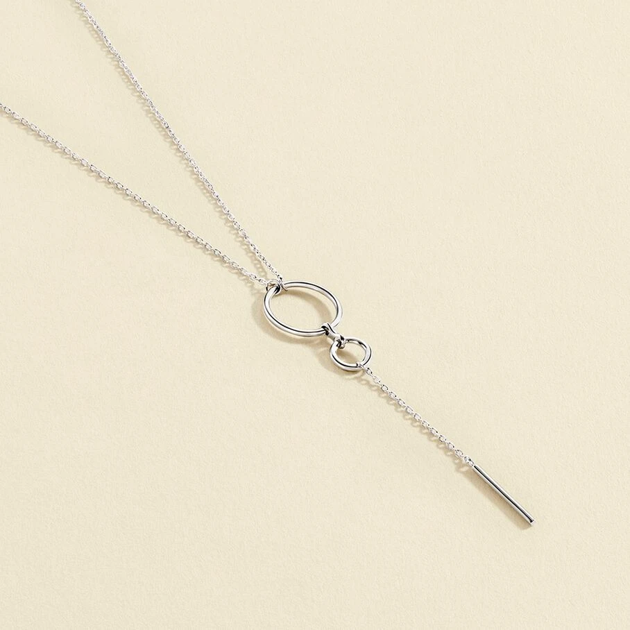 Collier Y, en argent véritable, avec une fine chaîne sur laquelle sont montés deux anneaux évidés de différentes tailles